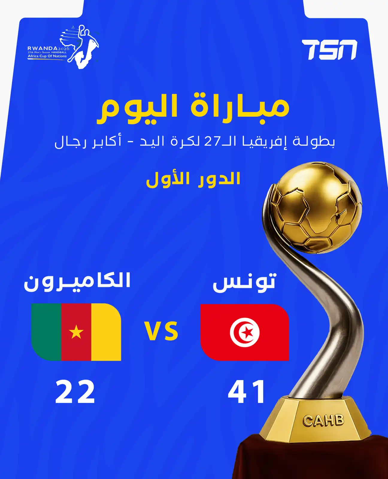 وفي المجموعة الثالثة، حقق منتخب تونس فوزا عريضا على حساب الكاميرون بنتيجة (41-22) في الجولة الافتتاحية.