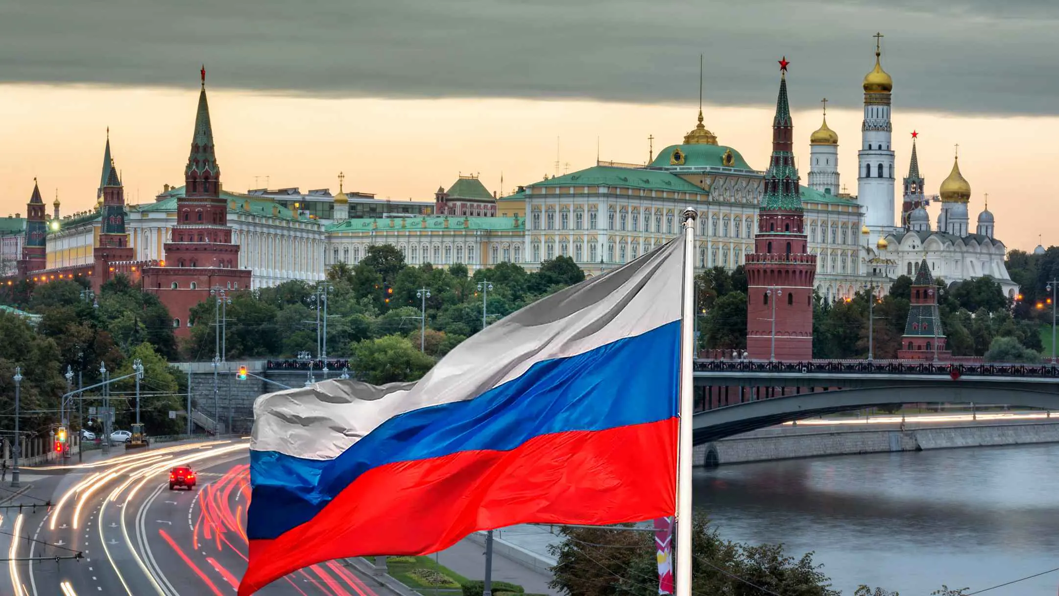 منظر للعلم الوطني للاتحاد الروسي مع إطلالة على الكرملين في موسكو 27 يناير 2024