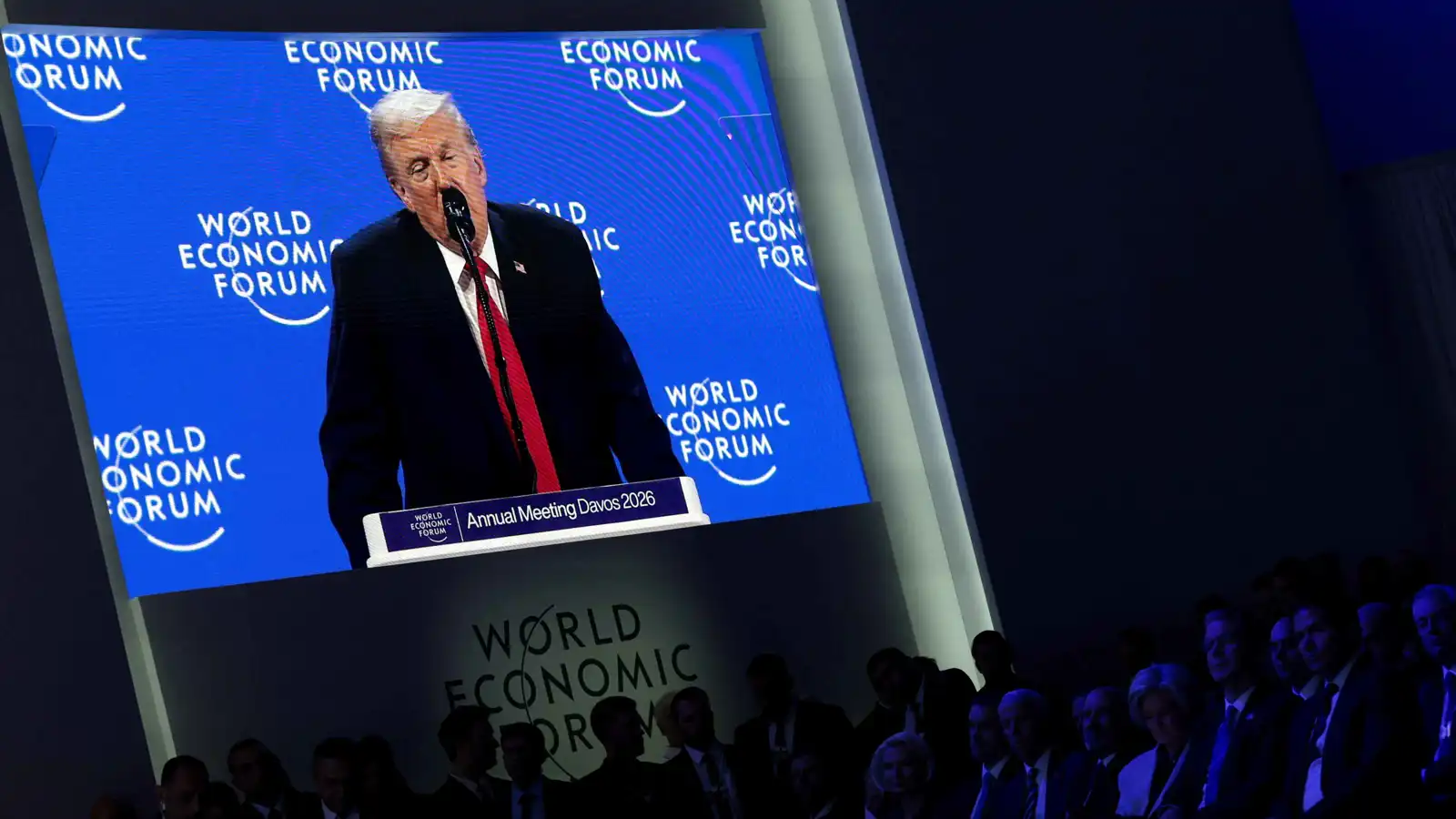 الرئيس الأميركي دونالد ترامب، يظهر على الشاشة وهو يلقي كلمة خلال إعلان ميثاق مبادرة «مجلس السلام»، على هامش المنتدى الاقتصادي العالمي السنوي السادس والخمسين في دافوس، سويسرا، في 22 يناير 2026.