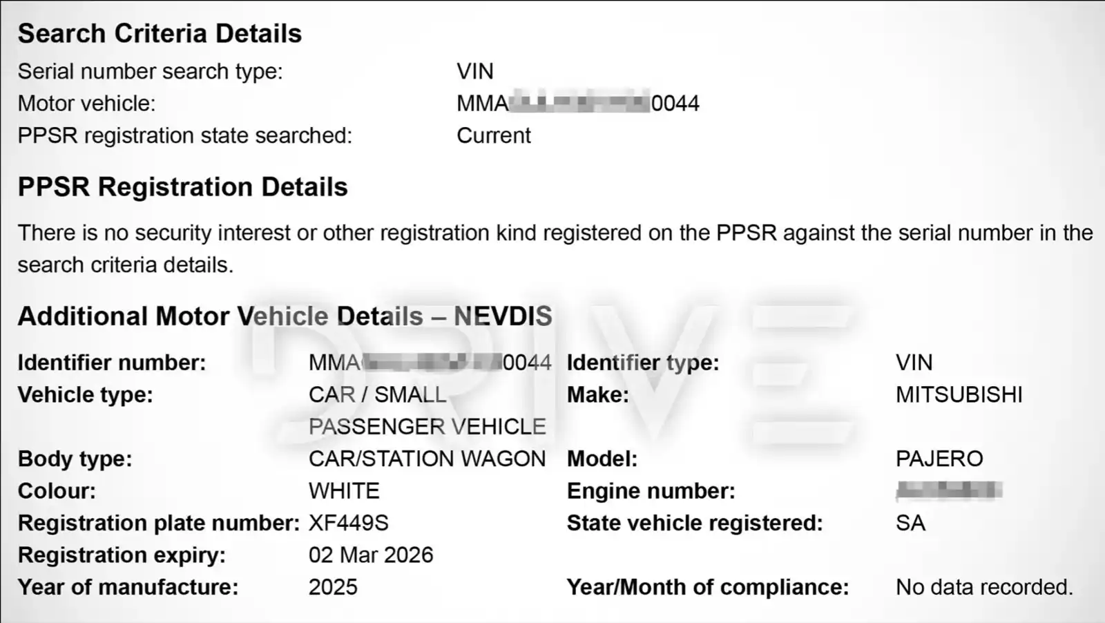 وثيقة تسجيل رسمية تُظهر إدراج اسم Pajero كطراز جديد من ميتسوبيشي، مع بيانات VIN وسنة تصنيع 2025، ما يؤكد عودة الاسم بشكل موثق.