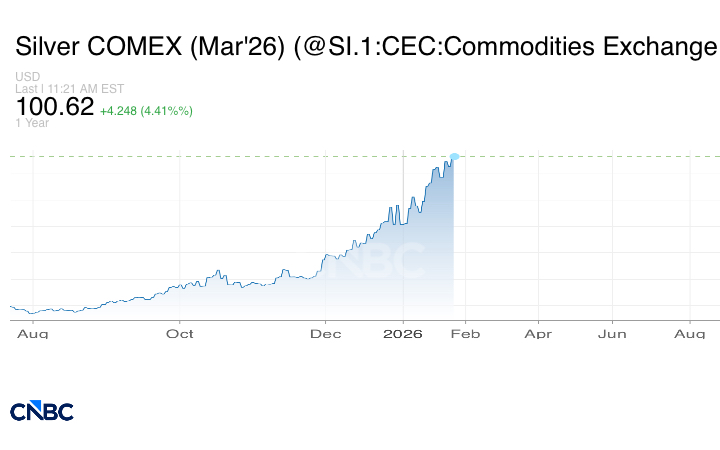 ويأتي ارتفاع الفضة لمستوى 100 دولار للأونصة مع إقبال المستثمرين على أصول الملاذ الآمن على خلفية الاضطرابات الجيوسياسية، ووسط توقعات بخفض مجلس الاحتياطي الفدرالي الأميركي أسعار الفائدة.