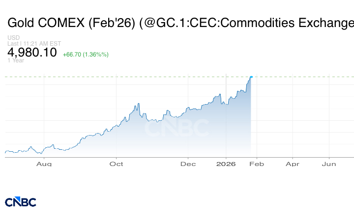 وارتفعت العقود الآجلة للذهب الأميركي تسليم فبراير/ شباط بنسبة 1.3% لتصل إلى 4978.60 دولاراً.