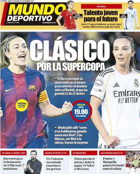 اهتمت الصحف والمواقع الرياضية العالمية الصادرة صباح اليوم السبت بعدة ملفات بارزة، في مقدمتها مواجهة فياريال وريال مدريد في الدوري الإسباني، إلى جانب نهائي كأس السوبر الإسباني للسيدات بين برشلونة وريال مدريد.