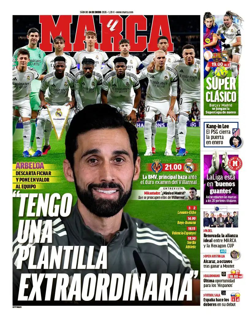 ركزت الصحيفة على مباراة ريال مدريد وفياريال، وتصريحات المدرب ألفارو أربيلوا، وكتبت: "أربيلوا: لدي فريق استثنائي".