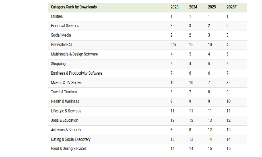 أما بالنسبة لتوقعات عام 2026، فتشير البيانات إلى أن إجمالي إنفاق المستهلكين على تطبيقات الجيل الجديد من الذكاء الاصطناعي سيزيد على 10 مليارات دولار، مما يجعل هذه الفئة ضمن الأكثر ربحية في سوق تطبيقات الهواتف المحمولة. ويُتوقع أن تنتقل هذه الفئة من المرتبة العاشرة في التنزيلات عام 2025 إلى المرتبة الرابعة عام 2026، متفوقة على فئات راسخة مثل برامج الوسائط المتعددة، والتصميم، والتسوق.
