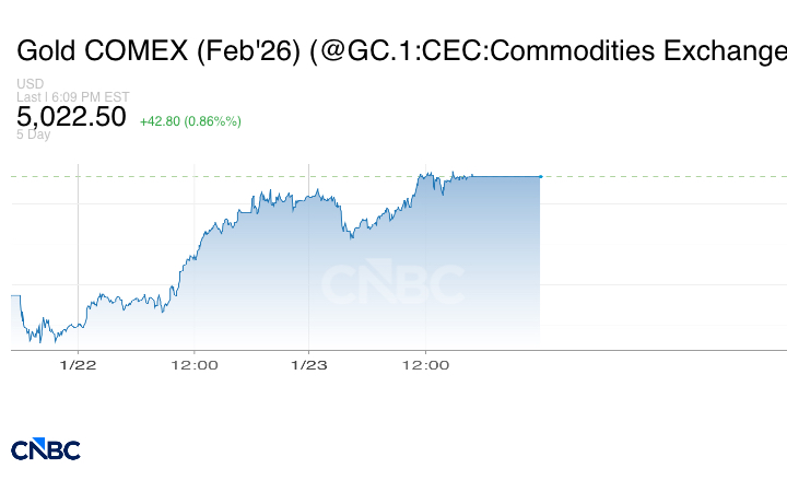 قفز الذهب إلى مستوى قياسي، متجاوزاً مستوى 5000 دولار للأونصة، في مطلع تداولات الاثنين 26 يناير/ كانون الثاني، مواصلاً ارتفاعه التاريخي مع إقبال المستثمرين على الأصول الآمنة وسط تصاعد التوترات الجيوسياسية.