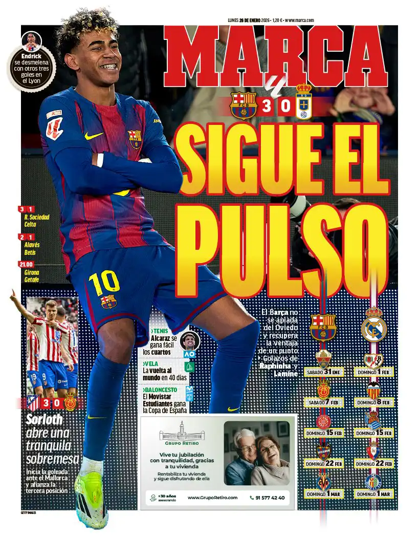 ركزت الصحيفة على فوز برشلونة 3-0 على ريال أوفييدو واستعادته صدارة الدوري الإسباني، وكتبت:
