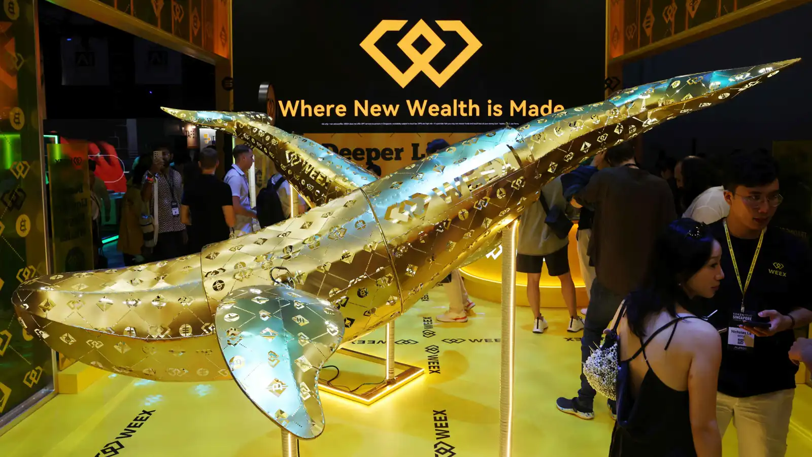 مجسم لأحد الحيتان الذهبية في مؤتمر TOKEN2049 للعملات المشفرة في سنغافورة يوم 1 أكتوبر 2025.
