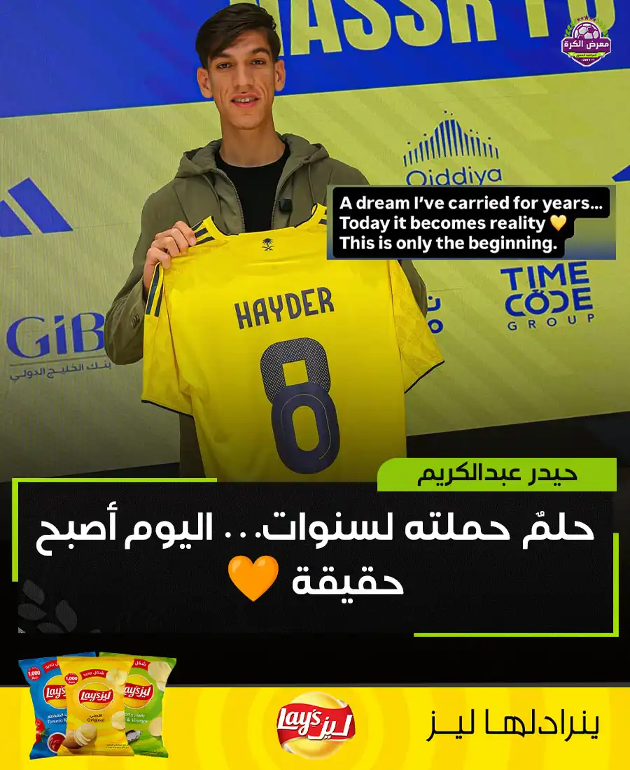 كشف النجم الواعد للكرة العراقية حيدر عبد الكريم الوافد الجديد على نادي النصر السعودي عن أول تصريحاته بعد انضمامه للفريق رسميا خلال فترة الانتقالات الشتوية الجارية.