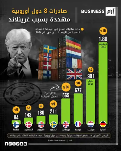 كشفت بيانات تجارية حديثة عن تعرض صادرات 8 دول أوروبية إلى الولايات المتحدة لمخاطر متزايدة، في ظل تهديدات الرئيس الأميركي دونالد ترامب بفرض تعريفات جمركية جديدة، بسبب معارضة هذه الدول لخطة ضم جزيرة غرينلاند.