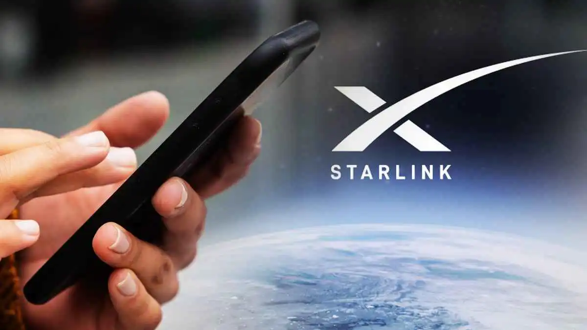تُظهر الصورة يداً تمسك بهاتف ذكي وتستخدمه، بينما يظهر على يمين الصورة شعار «ستارلينك».