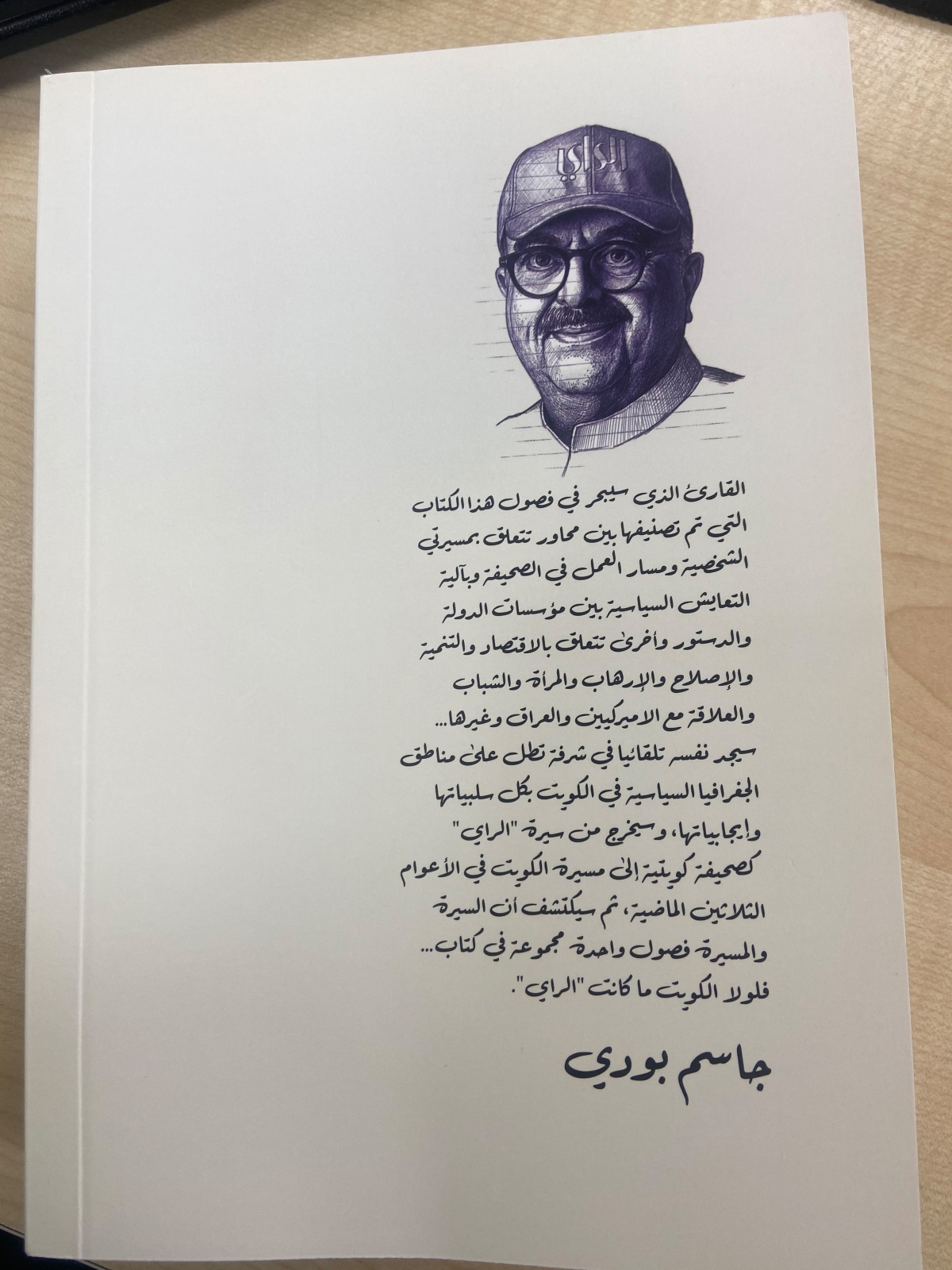 واستطرد بودي للحديث عن مسار العمل في الصحيفة، قائلاً إن: «القارئ الذي سيبحر في فصول الكتاب التي تم تصنيفها بين محاور تتعلق بمسيرتي الشخصية ومسار العمل في الصحيفة وبآلية التعايش السياسية بين مؤسسات الدولة والدستور، وأخرى تتعلق بالاقتصاد والتنمية والإصلاح والإرهاب والمرأة والشباب والعلاقة مع الأميركيين والعراق، وغيرها، سيجد نفسه تلقائياً في شرفة تطل على مناطق الجغرافيا السياسية في الكويت بكل سلبياتها وإيجابياتها، وسيخرج من سيرة (الرأي) كصحيفة كويتية إلى مسيرة الكويت في الأعوام الثلاثين الماضية، ثم سيكتشف أن السيرة والمسيرة فصول واحدة مجموعة في كتاب... فلولا الكويت ما كانت (الرأي)».