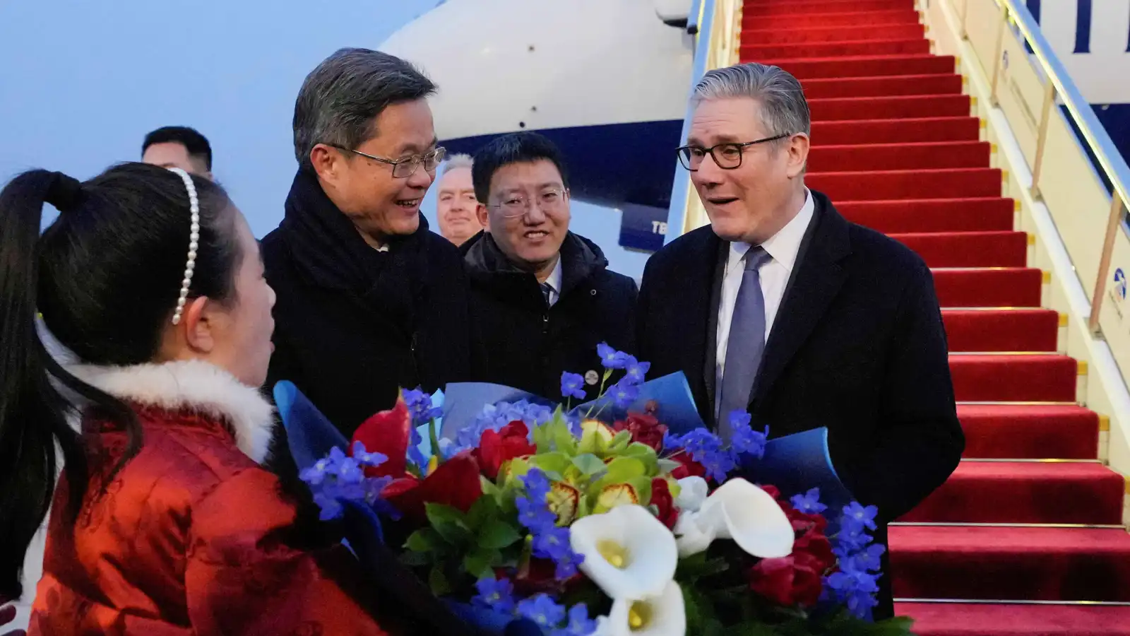رئيس الوزراء البريطاني كير ستارمر يتسلم باقة من الزهور في مطار بكين، الصين، يوم 28 يناير 2026