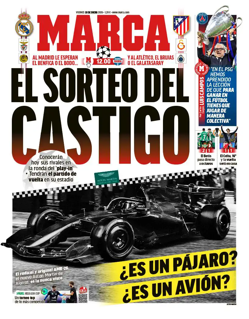 اهتمت صحيفة ماركا في غلافها بقرعة دوري أبطال أوروبا والمواجهات المرتقبة للفرق الإسبانية التي تأهلت للملحق الفاصل وعلى رأسها ريال مدريد.