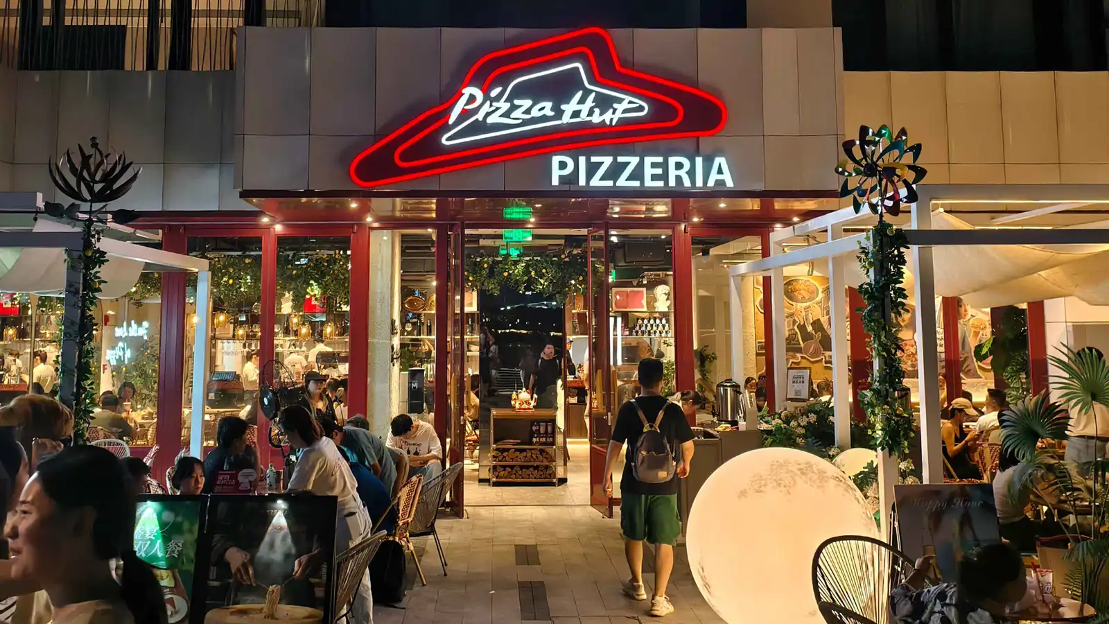سياح يتناولون الطعام في مطعم «بيتزا هت» للوجبات السريعة على ضفاف نهر هوانغبو في شنغهاي، الصين، في 24 أغسطس 2025.