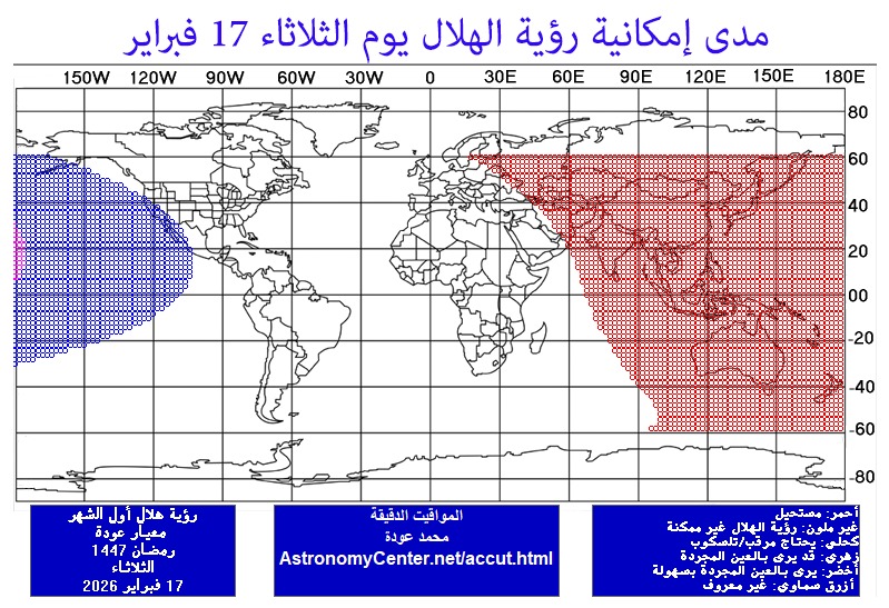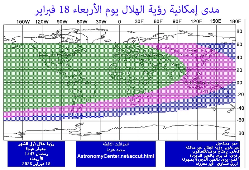 الأربعاء 18 شباط: الرؤية ممكنة وسهلة بالنسبة للدول التي ستتحرى الهلال يوم الأربعاء (مثل المغرب، باكستان، وإيران)، فإن وضع الهلال سيكون مواتيا جدا للرؤية: