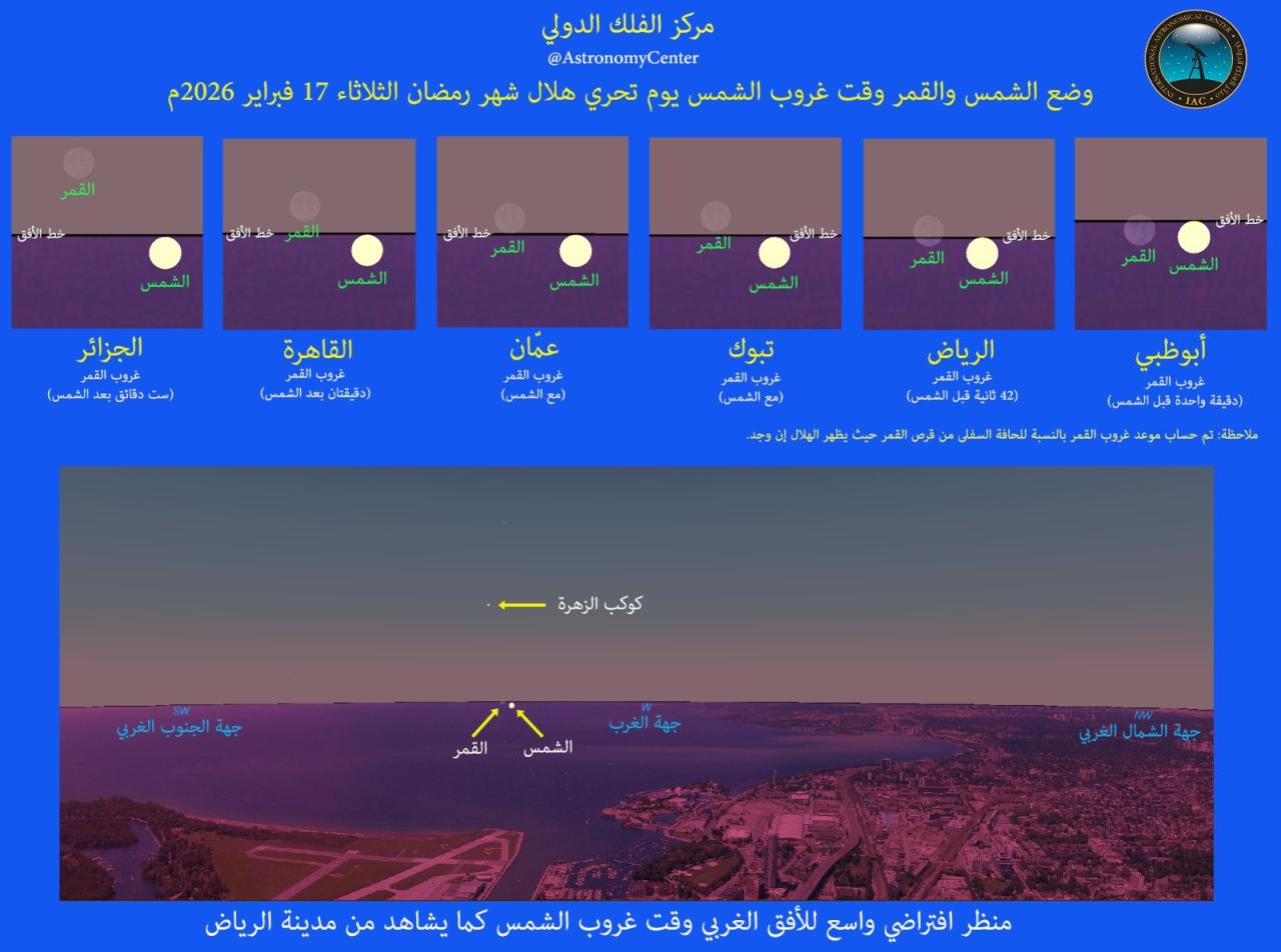 أصدر مركز الفلك الدولي بيانا علميا شاملا حول ظروف رؤية هلال شهر رمضان المبارك لعام 1447 هـ، مؤكدا أن رؤية الهلال يوم الثلاثاء 17 شباط / فبراير 2026 ستكون "مستحيلة أو غير ممكنة" من جميع مناطق العالم العربي والإسلامي، سواء بالعين المجردة أو التلسكوب، أو حتى باستخدام تقنيات التصوير الفائقة.