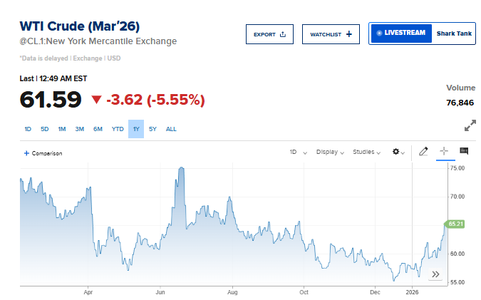 فيما تراجع خام غرب تكساس الوسيط الأميركي 5.5%، إلى 61.59 دولار للبرميل.