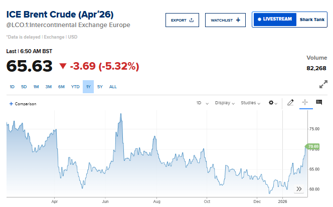 وانخفضت العقود الآجلة لخام برنت 5.3%، إلى 65.63 دولار للبرميل.