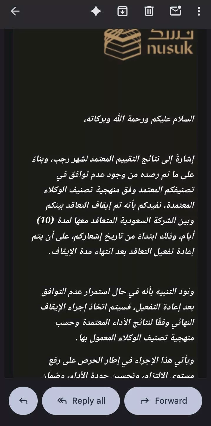 وأشار إلى أن بعض الوكلاء لم يكونوا على دراية بكيفية التعامل مع منصة "نسك"، ما أدى إلى تسجيل رحلات فردية أو إدخال بيانات ناقصة للبرامج أو تجاوز إجراءات السكن، وهو ما يعتبر سلوكًا سلبيًا وفق المؤشرات، ويضعهم ضمن الفئة الحمراء، ليُمنحوا بعدها 10 أيام لتعديل أوضاعهم والعودة للعمل بشكل طبيعي.
