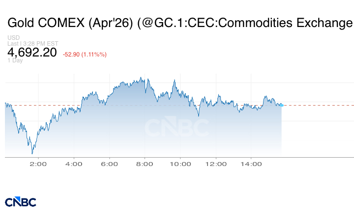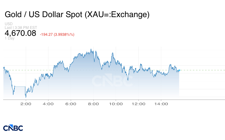 أما العقود الآجلة للذهب فقد انخفض سعرها بنسبة 1.6% لتبلغ عند التسوية 4,666 دولار.