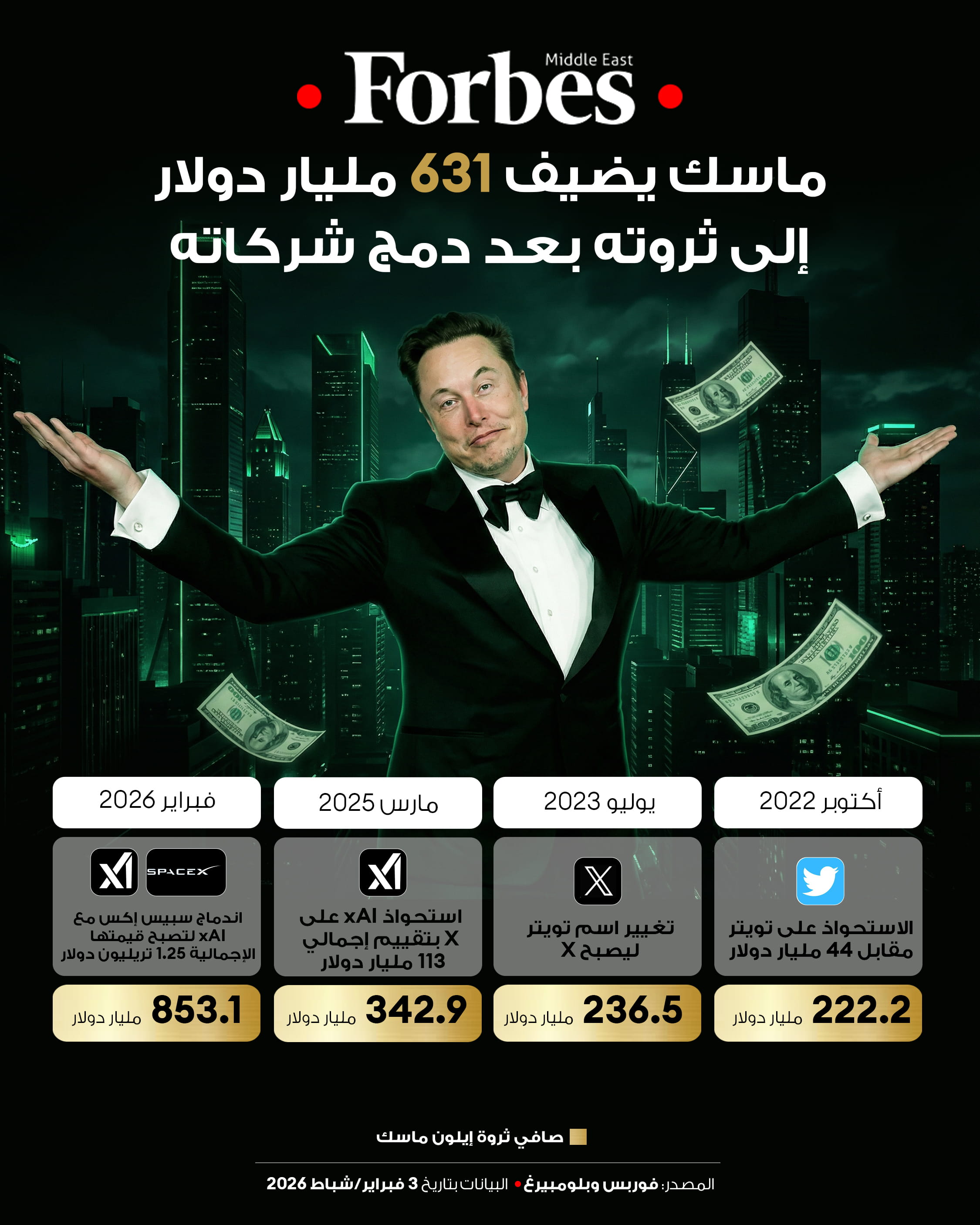 فيما يلي نظرة على أبرز تطورات صفقات الدمج والاستحواذ التي رفعت صافي ثروة ماسك إلى853.1 مليار دولار في 3 فبراير/شباط 2026 خلال التعاملات.