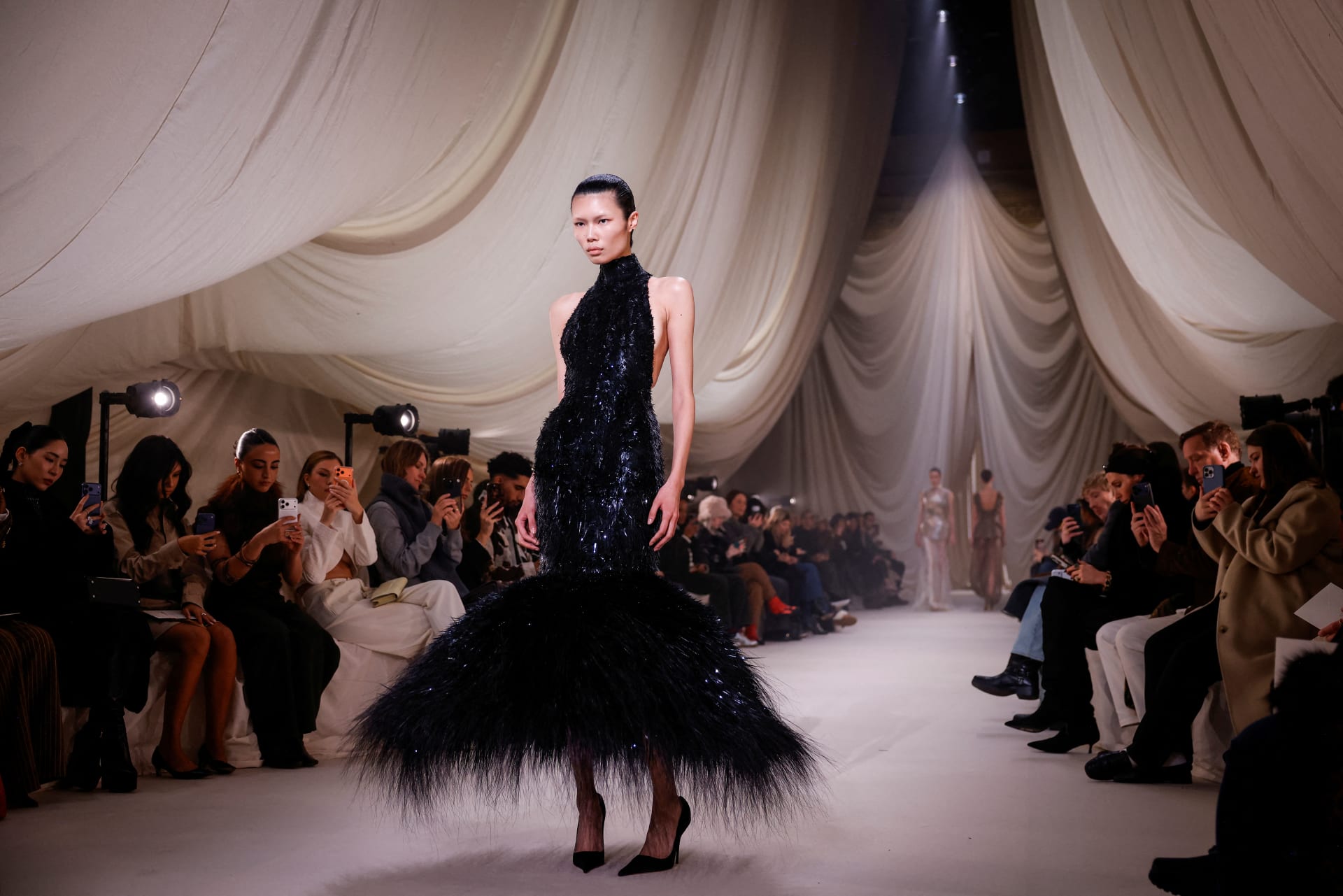 قدّمت علامة "آشي ستوديو"، للمصمم السعودي محمد آشي، رؤية قائمة على البناء المعماري الصارم، حيث تحوّلت الأزياء إلى هياكل نحتية. ارتكزت المجموعة على سترات مشدودة أقرب إلى قصّة الكورسيه، وتنّانير شفافة، وتفاصيل ريشية دقيقة.