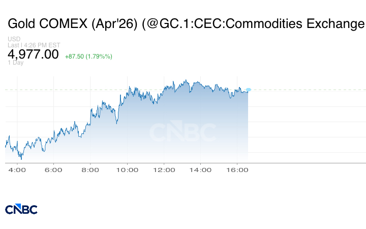 ووارتفعت العقود الآجلة للذهب الأميركي تسليم أبريل عند التسوية بنسبة 1.8% لتبلغ 4979.80 دولاراً للأونصة.