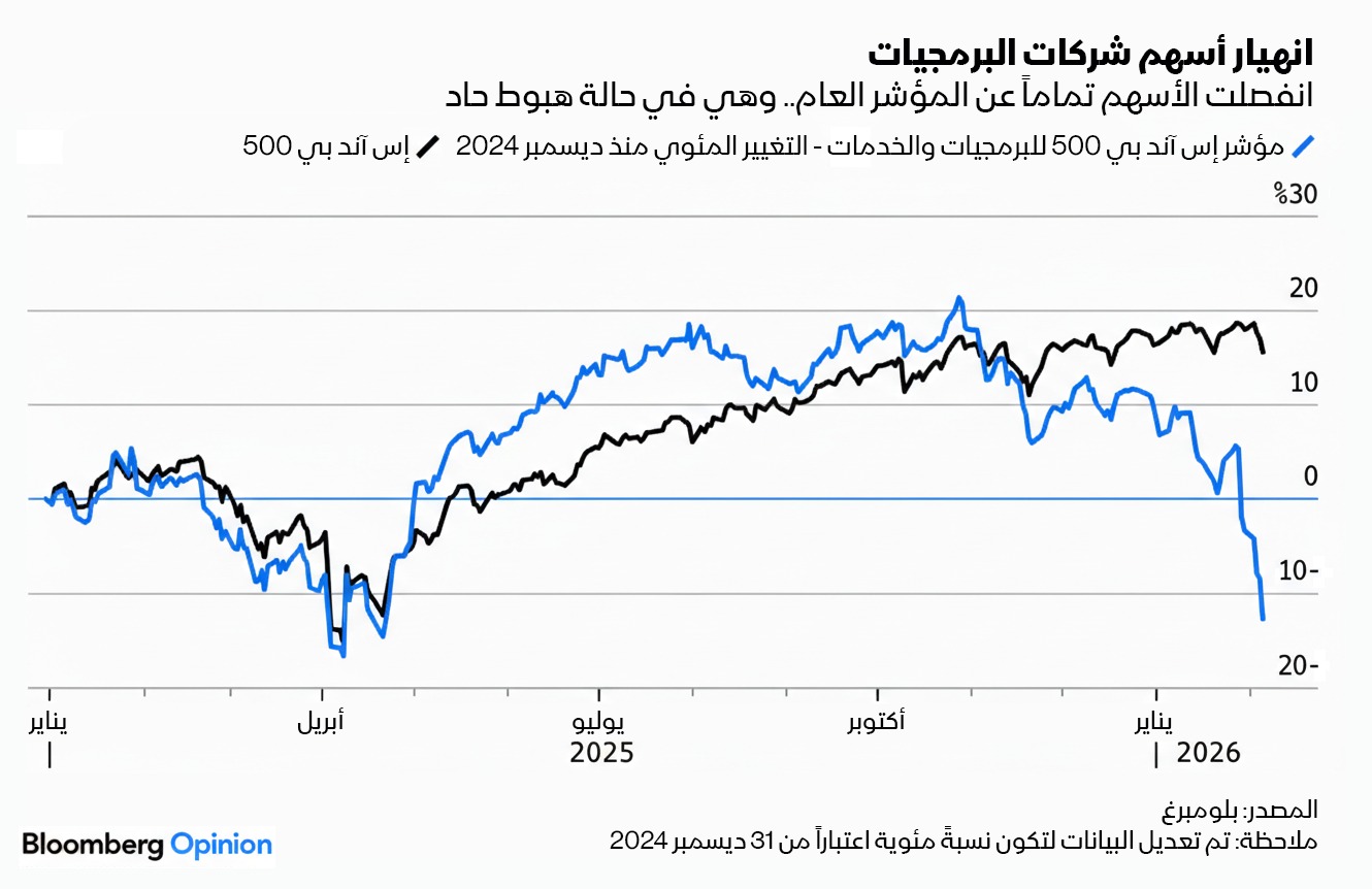 علاوة على ذلك، يتزايد قلق المستثمرين بشأن أسهم شركات البرمجيات. فعلى مدى العقد الماضي، اعتبرت شركات برمجيات المؤسسات القائمة على الاشتراكات مصدراً رئيسياً للأرباح، وكان ينظر إليها في البداية على أنها من المستفيدين المحتملين من ثورة الذكاء الاصطناعي، ما أدى إلى ارتفاع قيمتها السوقية بشكل كبير في نهاية عام 2025.