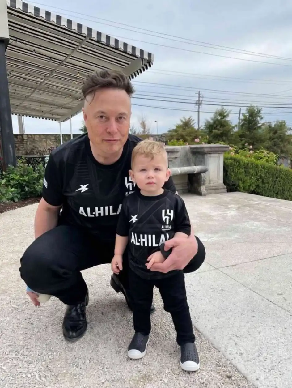 وظهر ماسك في الصورة المتداولة وهو يرتدي قميص الهلال باللون الأسود مع نجله.