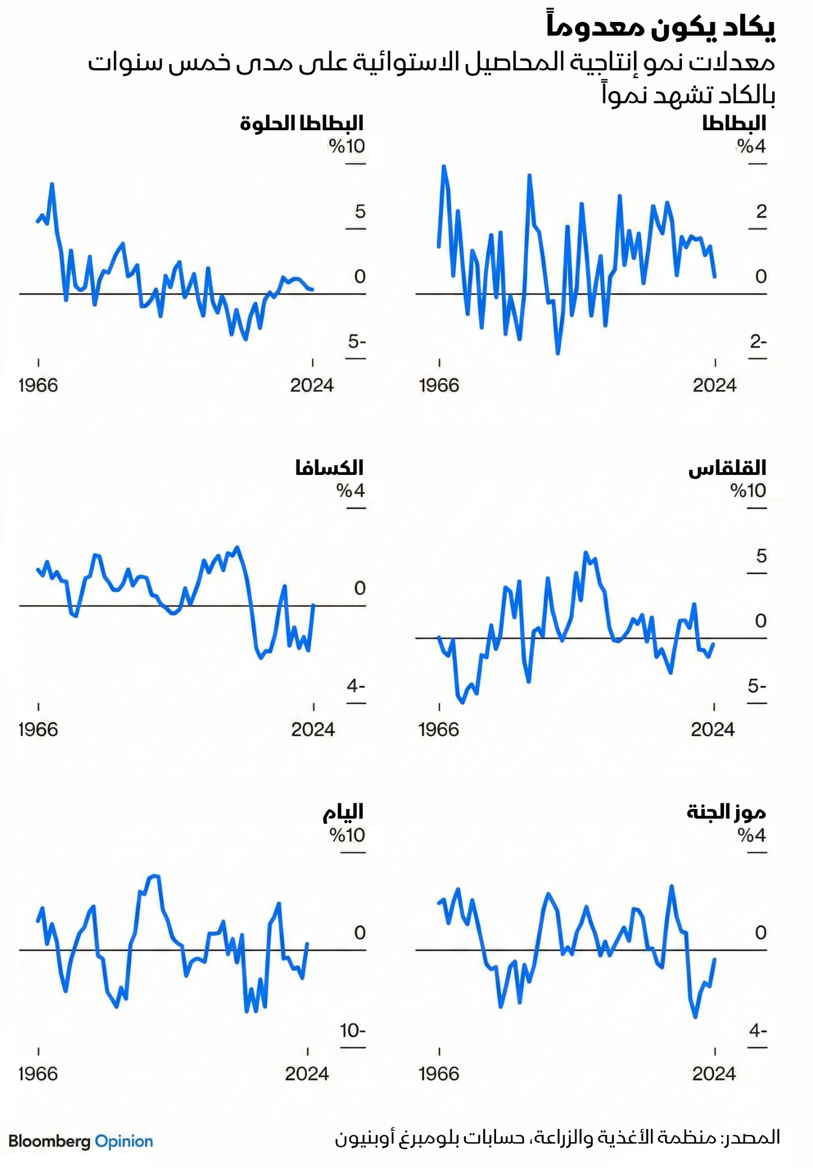 لكن هذا القانون الصارم قد ينهار تحت وطأة تغير المناخ. فقد نما الإنتاج الزراعي باستمرار بأكثر من 2% سنوياً على مدى ستة عقود، لكنه تباطأ منذ عام 2020 إلى 1.63%.