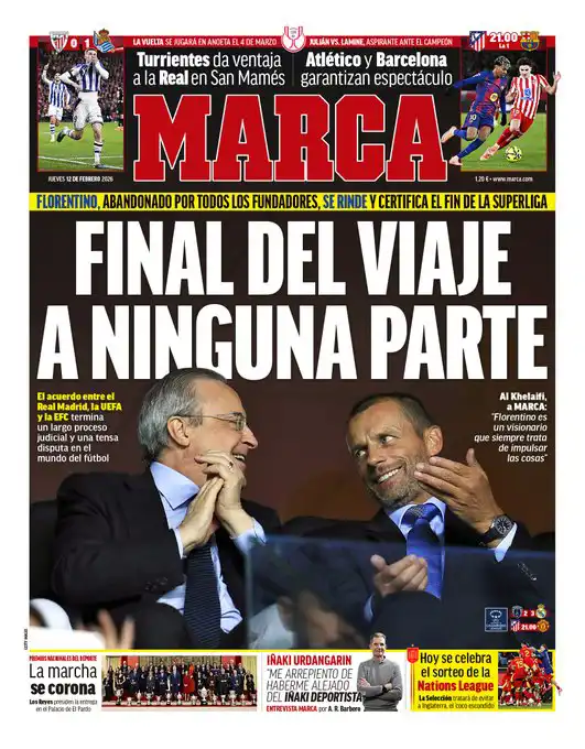 ركزت الصحيفة الإسبانية على الاتفاق بين ريال مدريد والاتحاد الأوروبي لكرة القدم ورابطة الأندية الأوروبية بشأن دوري السوبر، وكتبت: "نهاية الرحلة إلى اللا مكان".