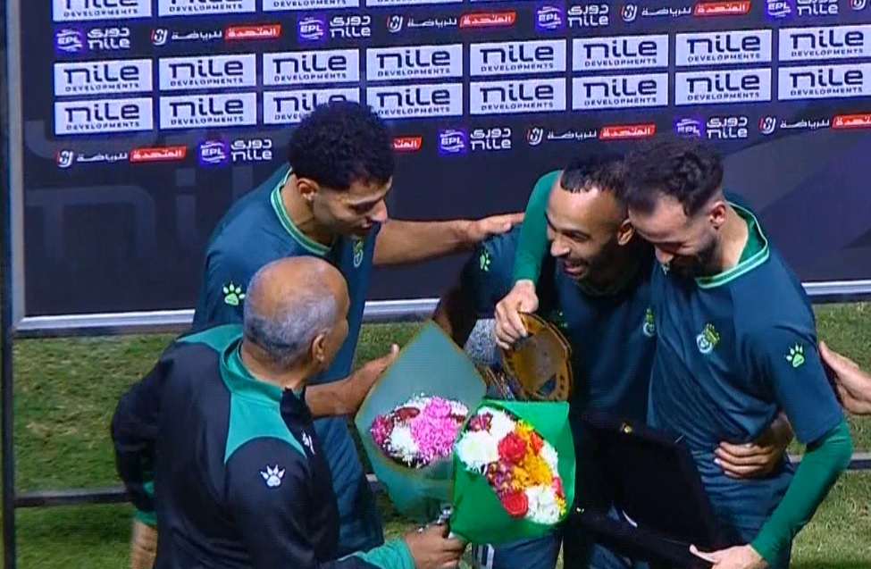 في لقطة طيبة.. احتفال محمد مجدي قفشه مع زميله محمود دونجا الفائز بجائزة نجم المباراة بين الاتحاد وسموحة، في بطولة الدوري المصري الممتاز
