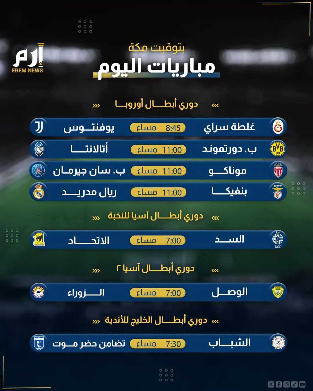 ويلتقي يوفنتوس الإيطالي خارج ملعبه منافسه غلطة سراي التركي بينما يستقبل بروسيا دورتموند الألماني منافسه أتالانتا الإيطالي.