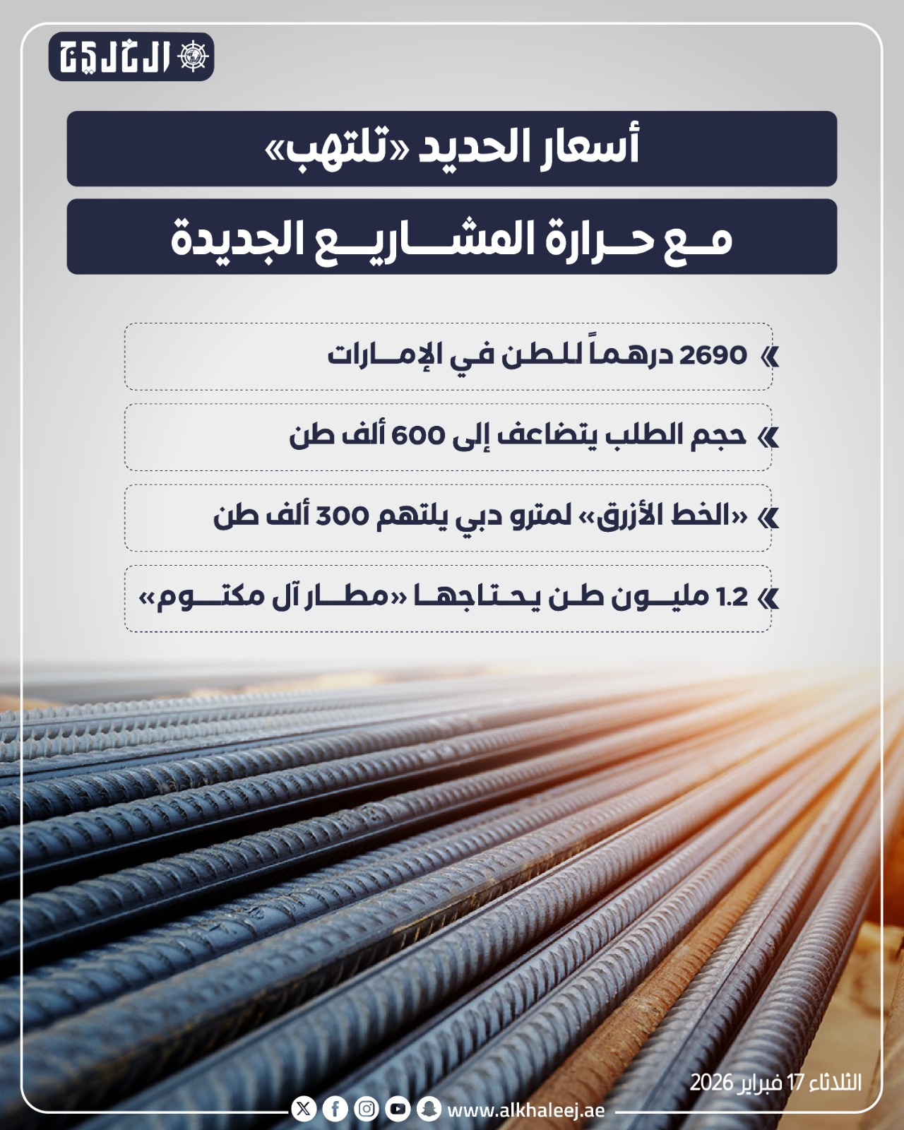 تشهد سوق الحديد في دولة الإمارات، موجة صعود جديدة مدفوعة بطفرة المشاريع الكبرى وتسارع وتيرة الإنشاءات، ما دفع متوسط الأسعار للارتفاع من إنتاج «حديد الإمارات» التابعة لـ"إمستيل" نحو 2,690 درهماً، مقابل 2,550 درهماً في السوق الثانوية.