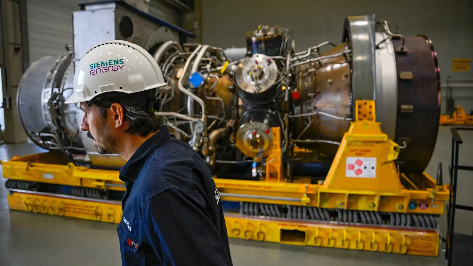 عامل يقف أمام توربينة تابعة لخط أنابيب نورد ستريم 1 في مصنع شركة سيمنز للطاقة، بمدينة مولهايم آن دير رور، غرب ألمانيا، يوم 3 أغسطس 2022
