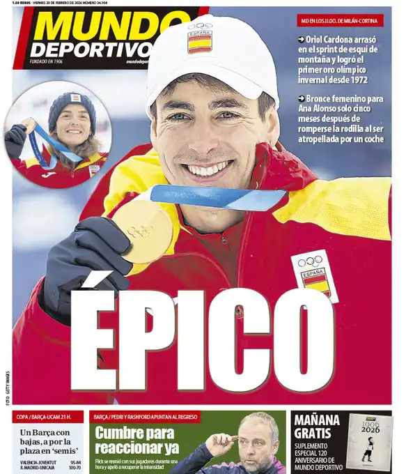 وركزت الصحيفة على تتويج الإسباني أوريول كاردونا بميدالية ذهبية في دورة الألعاب الأولمبية الشتوية بجانب مواطنته أنا ألونسو التي حصلت على الميدالية البرونزية.