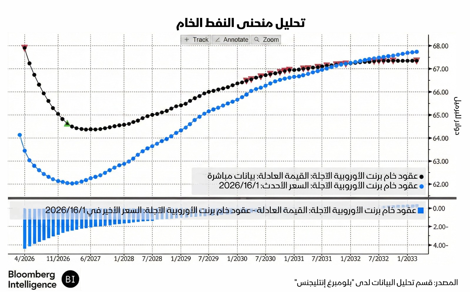 تراجعت تقديرات "بلومبرغ إنتليجنس" للقيمة العادلة بشكل حاد منذ منتصف 2024، مدفوعةً بنمو إمدادات المنتجين من خارج "أوبك"، والزيادات التدريجية في إنتاج (أوبك+) وتراكم المخزونات، وهي عوامل تشير بوضوح إلى احتمال حدوث فائض خلال عام 2026، ما لم يحدث تصعيد جيوسياسي كبير.