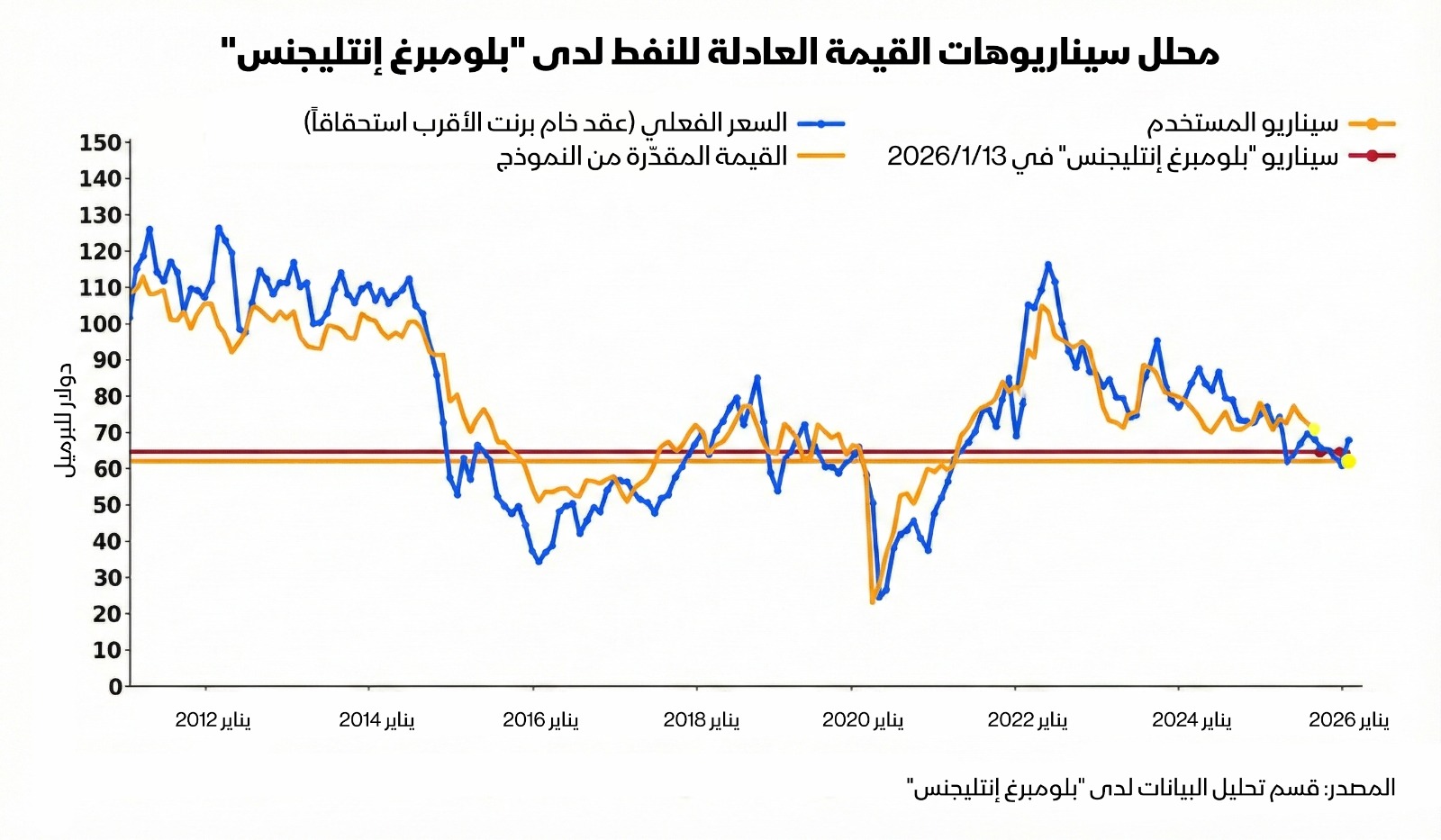 أظهر نموذج أعدته "بلومبرغ إنتليجنس" أن القيمة العادلة لخام برنت تبلغ 62 دولاراً للبرميل، أي أقل من متوسط توقعات السوق البالغ 69 دولاراً خلال الربع الأول من 2026، الذي يتضمن علاوة جيوسياسية مرتبطة بالتوترات بين الولايات المتحدة وإيران، رغم عدم حدوث أي اضطراب حقيقي حتى الآن.