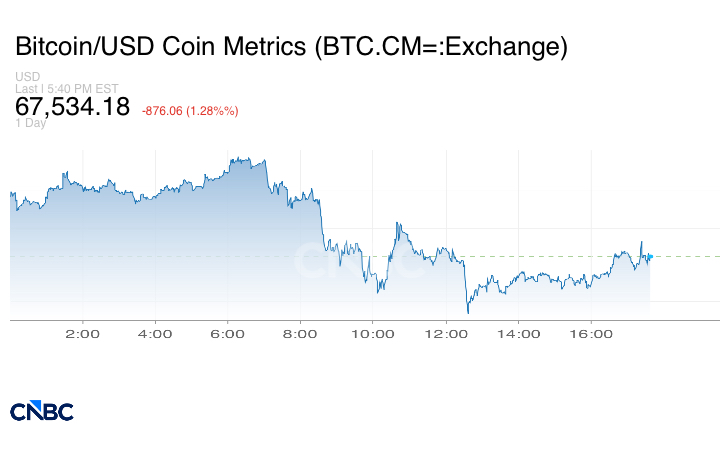 وشهدت سوق العملات المشفرة اليوم موجة هبوط وخسرت المليارات من قيمتها السوقية، حيث تراجعت بتكوين 1.28% لتصل إلى 67.539.55 دولار.
