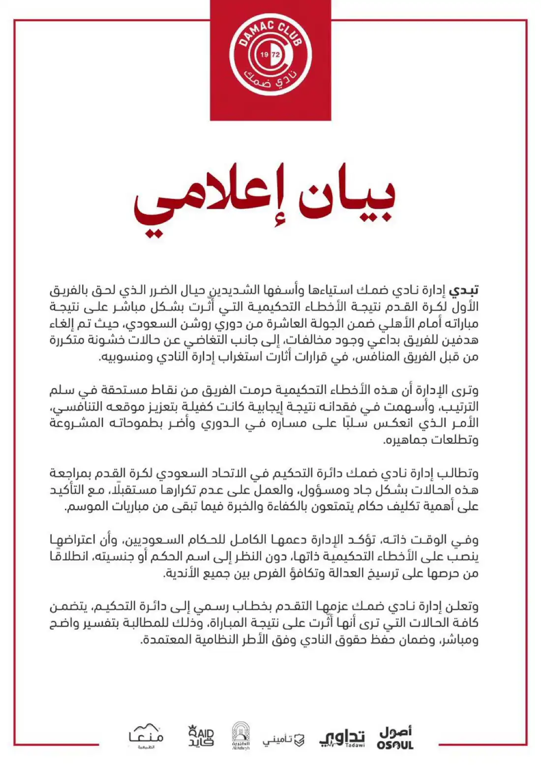 بيان رسمي من ضمك ضد حكم مباراة الأهلي السعودي (صورة)