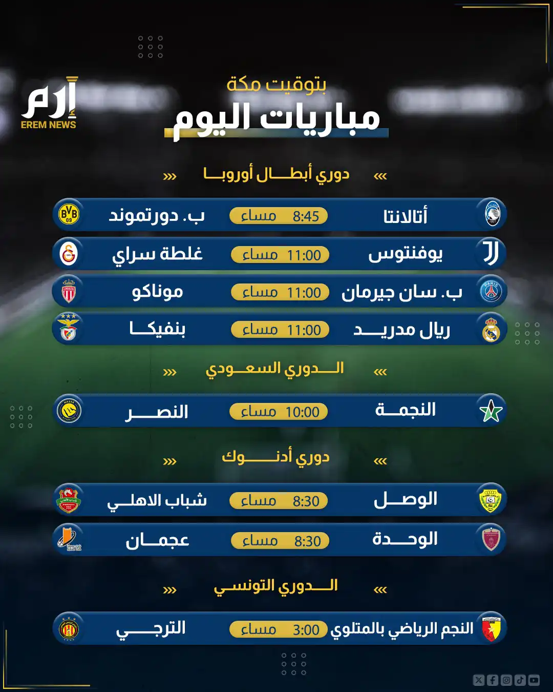 ريال مدريد وباريس والنصر.. مواعيد مباريات اليوم والقنوات الناقلة