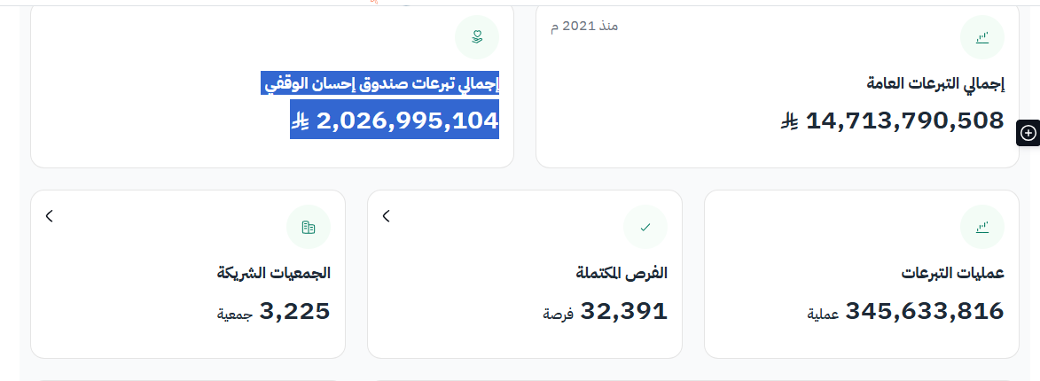 14.7 مليار ريال إجمالي التبرعات منذ 2021 وساهمت التبرعات في رفع إجمالي التبرعات العامة منذ انطلاق إحسان عام 2021 إلى نحو 14.7 مليار ريال، لتغطي مختلف المجالات الصحية والسكنية والتعليمية والاجتماعية، مستفيدةً من الحوكمة الرقمية المتقدمة التي تدعمها الهيئة السعودية للبيانات والذكاء الاصطناعي (سدايا).