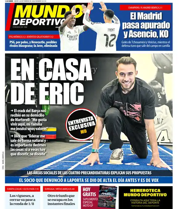 اهتمت الصحيفة بتأهل ريال مدريد إلى دور الـ16 من دوري أبطال أوروبا بعد الفوز على بنفيكا 2-1 في الملحق، وكتبت: "فينيسيوس يقود الفريق للتأهل إلى الدور المقبل"، و"فينيسيوس يُتوج الريمونتادا بإنهاء رائع للهجمة ليعبر بالفريق إلى دور الـ16"، و"سبورتينغ البرتغالي أو مانشستر سيتي هو الخصم المحتمل".
