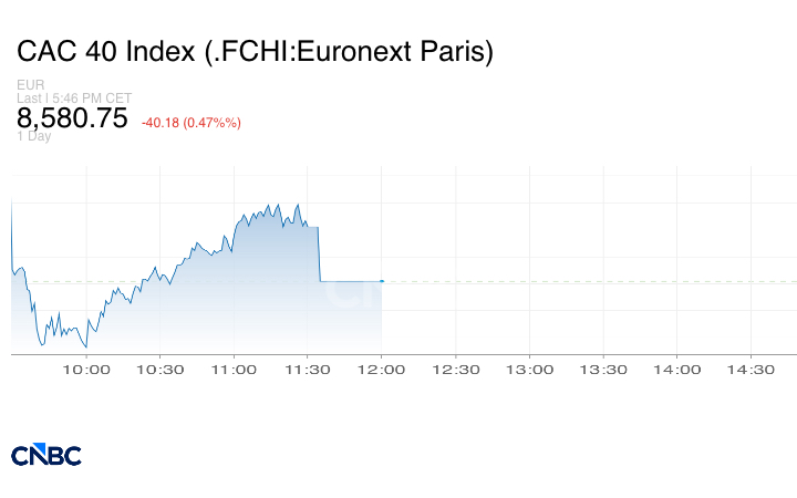 وتراجع مؤشر كاك 40 الفرنسي بنسبة 0.47% ليصل إلى 8,580.10 نقطة.