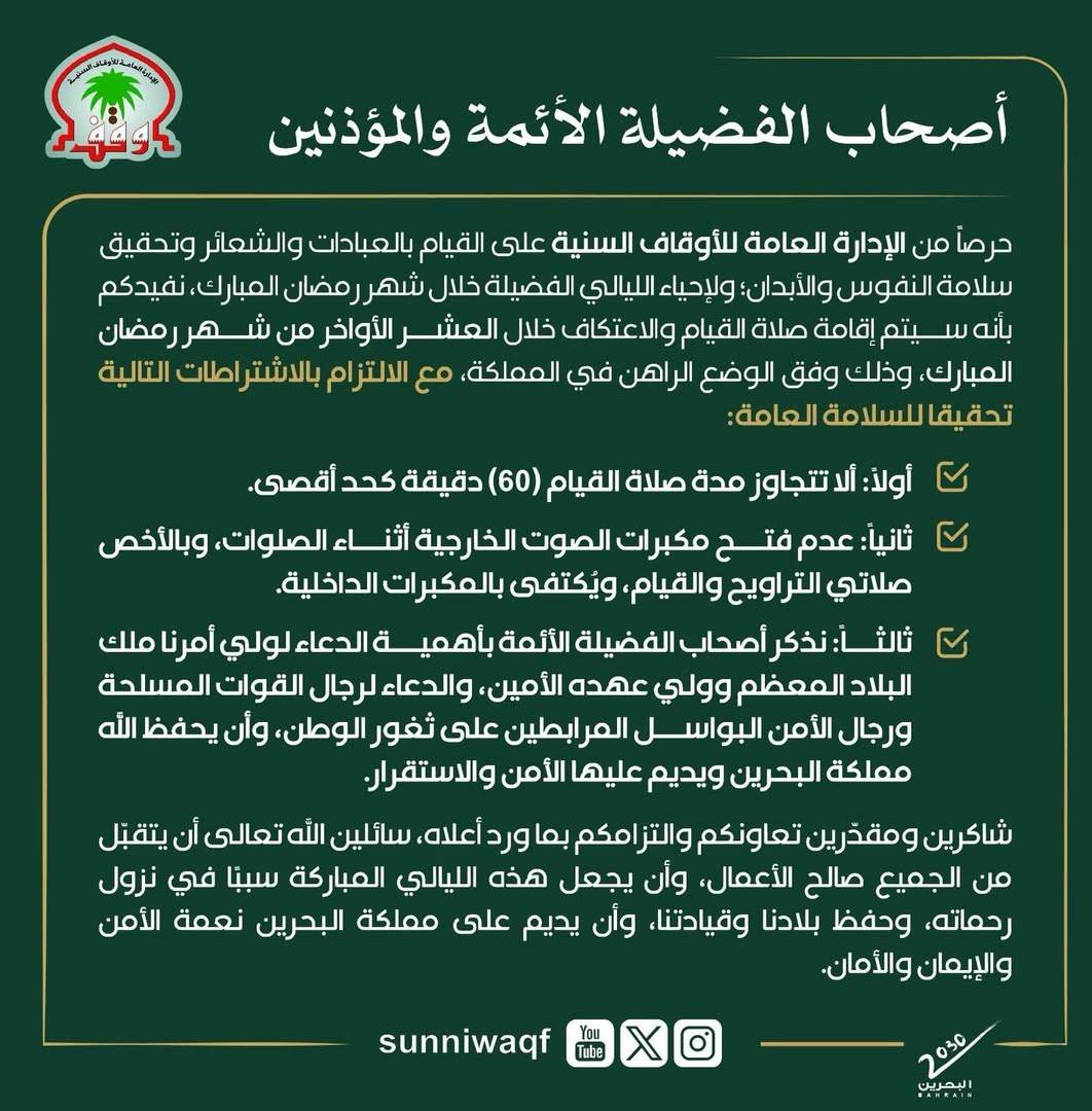وأوضحت الإدارة، في تعميم موجّه إلى الأئمة، أن إقامة صلاة القيام ستتم وفق الوضع الراهن في مملكة البحرين، مع الالتزام بعدد من الاشتراطات التنظيمية التي تهدف إلى تعزيز السلامة العامة.