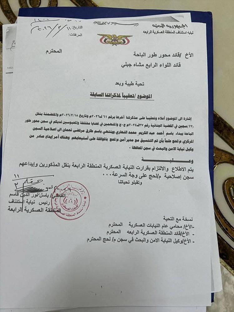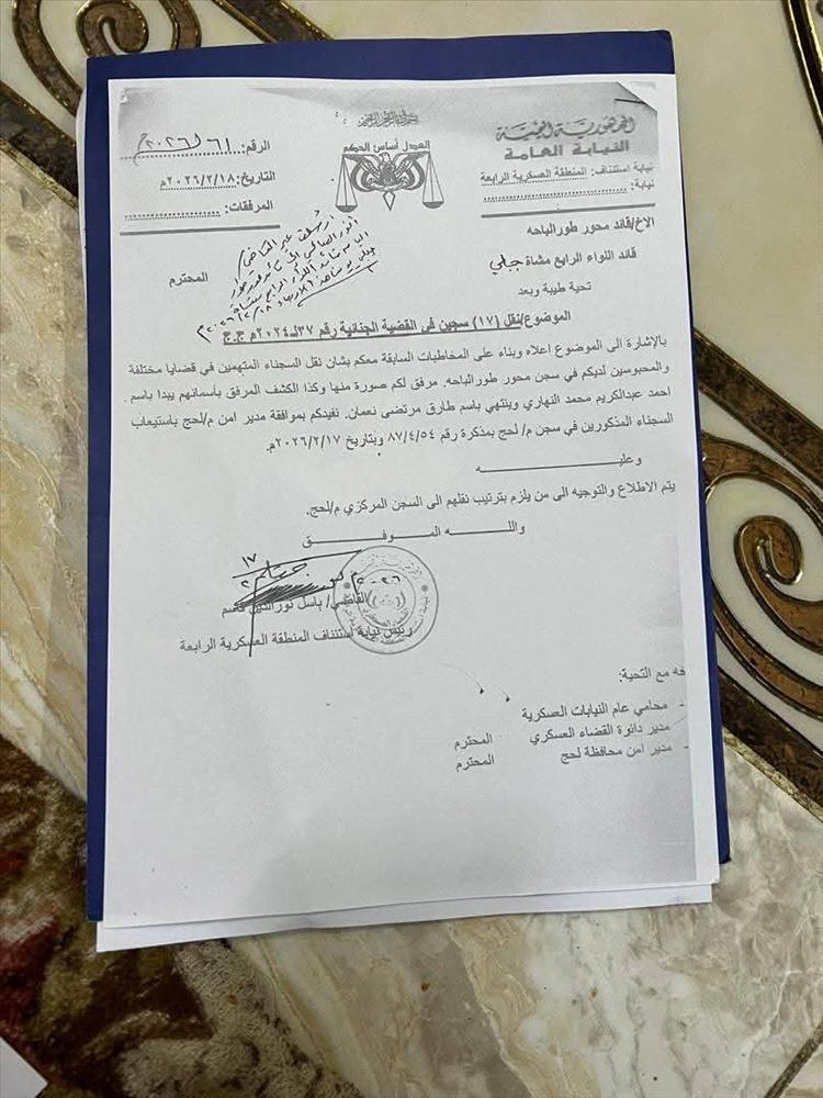 وبحسب الوثائق المؤرخة في 18 فبراير 2026، فقد أصدرت النيابة العسكرية أوامر واضحة تقضي بنقل سجناء محتجزين في سجن طور الباحة إلى السجن المركزي في لحج، بعد أن أمضى بعضهم سنوات في الاحتجاز دون صدور أحكام قضائية بحقهم.