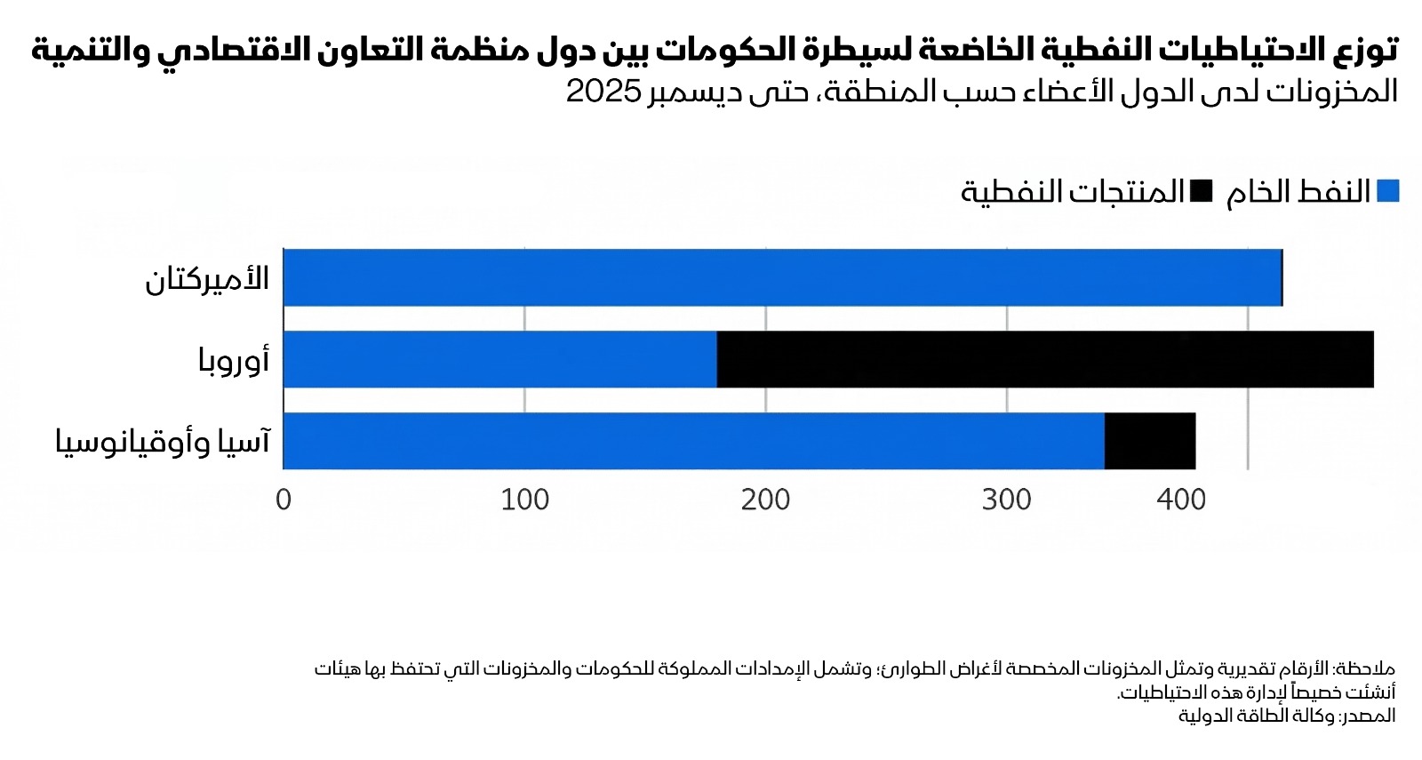 كم حجم احتياطي النفط الاستراتيجي؟ يحتفظ أعضاء وكالة الطاقة الدولية حالياً بأكثر من 1.2 مليار برميل من مخزونات الطوارئ، إضافة إلى نحو 600 مليون برميل أخرى لدى القطاع الصناعي خاضعة لالتزامات حكومية.