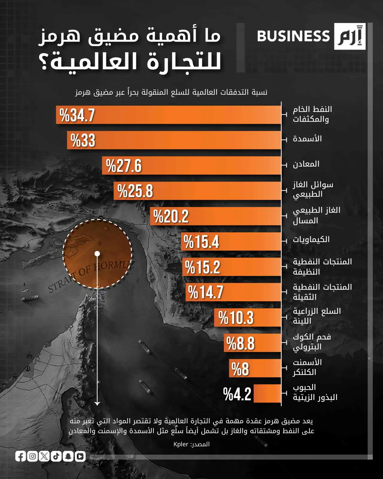 يعدّ «مضيق هرمز» أهم نقطة عبور للطاقة في العالم، إذ يمر عبره نحو 20 مليون برميل يومياً من النفط والمنتجات النفطية، أي ما يعادل قرابة ربع تجارة النفط المنقولة بحراً عالمياً، وفق بيانات «إدارة معلومات الطاقة الأميركية» (EIA). كما يمر عبر المضيق نحو 20% من تجارة الغاز الطبيعي المسال في العالم، ما يجعله محوراً أساسياً لإمدادات الطاقة العالمية، خصوصاً للأسواق الآسيوية التي تستقبل غالبية النفط المتدفق عبره.