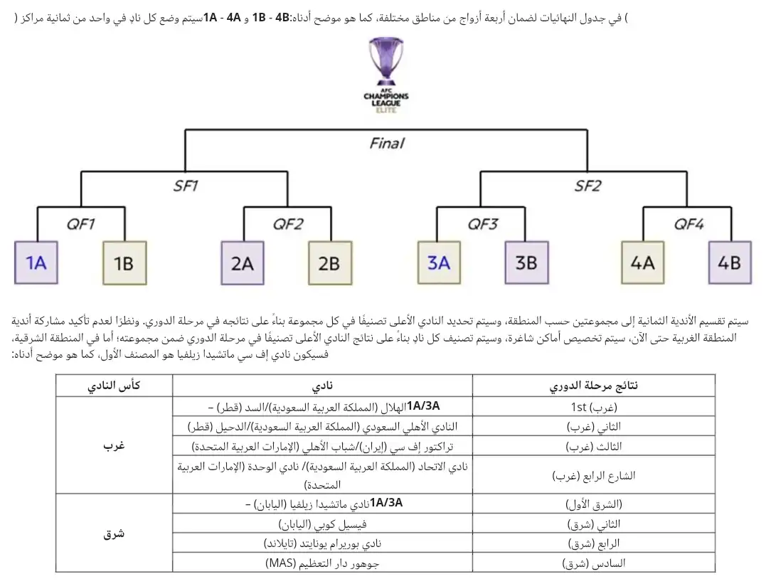 وبحسب موقع الاتحاد الآسيوي، سيتم تقسيم الأندية الثمانية إلى مجموعتين بحسب المنطقة، على أن يُحدد النادي الأعلى تصنيفًا في كل مجموعة استنادًا إلى نتائجه في مرحلة الدوري، ونظرًا لعدم حسم هوية أندية الغرب بعد، سيتم تخصيص أماكن مؤقتة لها،.....